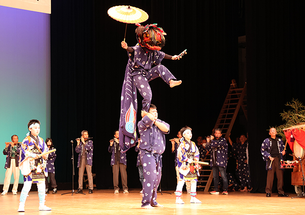 伝統文化継承の機運を高め、担い手育成につなげようと、「地域伝統文化保存事業実行委員会」(委員長=尾上慶昌教育長)が2017年から主催する行事。コロナ禍の中止をはさみ5年ぶり4回目となる今回は塩屋荒神社獅子舞、尾崎獅子舞など4つの保存会が出演した。天和獅子舞は山形に組んだはしごの上で獅子が舞う「ハシゴ」が注目を集め、原獅子舞は「猿」に扮した子どもの仕草が観客を楽しませた。