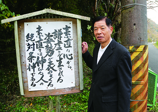 ▼路傍に善意の書、続けて30年=高野の田端地区で市道沿いに人生訓や警句などを月替わりで張り出す掲示板。近くに住む元警察官の鎌田正彰さん(78)が事故のない明るい社会を願って30年書き続けている。