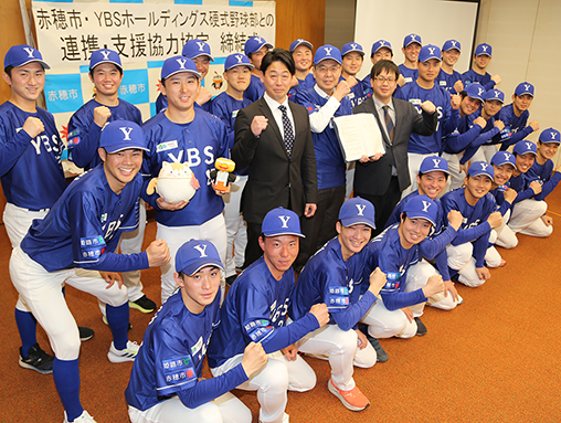 ▼社会人野球チームが赤穂に本拠地=YBSホールディングス硬式野球部と赤穂市が連携協定を結び、本拠地を城南緑地の赤穂トラストホープ球場に。