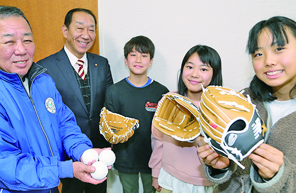 ▼赤穂の小学校にも「大谷グローブ」=メジャーリーガーの大谷翔平選手が全国の小学校に寄贈したグローブが赤穂市にも到着。赤穂市少年野球連絡会(河原智士会長)から贈呈された公式球とともに市内10校に。