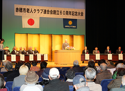 ▼市老人ク連合会が60周年=シニア世代の仲間づくりを通した生きがいや健康づくり、地域貢献を目的とする赤穂市老人クラブ連合会(福本俊弘会長)が創立60周年を祝う記念式典。