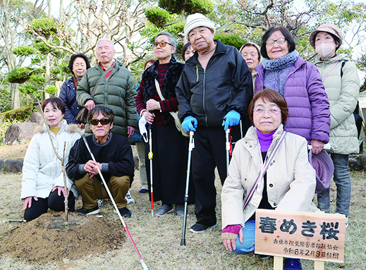 ▼「春めき桜」植樹=見た目の美しさに加え、香りの良さも特長の桜の品種「春めき桜」を赤穂市視覚障害者福祉協会(目木伸幸会長)が城南緑地と総合福祉会館中庭に植樹。