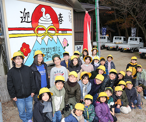 有年小学校の6年生児童が合同で2025年の干支「巳」を描いた大絵馬を制作。学校近くの東有年八幡神社に奉納した。境内に一年間掲出される。