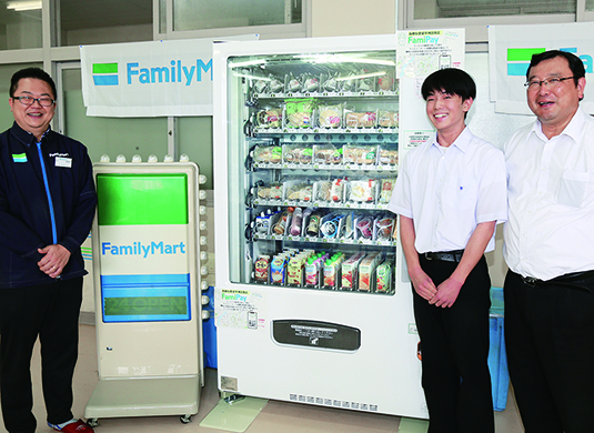 ▼赤穂高校にコンビニ自販機=昨年度で校内食堂が閉店した赤穂高校にコンビニエンス店が運営する自動販売機が導入。おにぎりやパン、スイーツなど多彩な商品を購入可能に。
