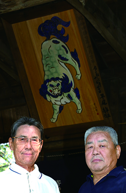 ▼亡祖父の思い受け継ぎ絵馬=52年前に亡祖父が東有年八幡神社に奉納した絵馬を後世に継承しようと、東有年の農業、平尾年正さん(64)と会社員の弟秀行さん(62)が唐獅子の絵馬を奉納。
