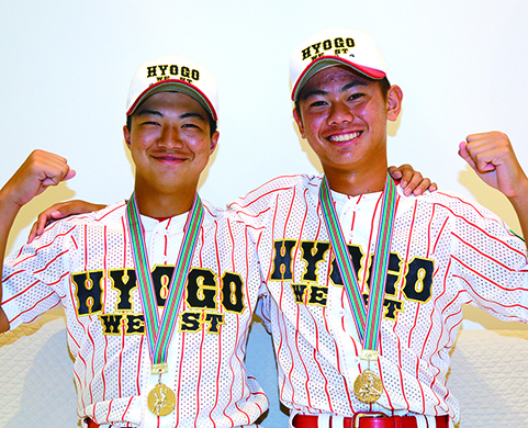 ▼少年野球の国際大会で優勝=少年硬式野球チーム「兵庫赤穂ヤング」の春名翔太投手(15)=赤穂東中3年=と井本啓仁捕手(14)=赤穂西中3年=が倉敷国際少年野球大会に兵庫西ヤング選抜のメンバーで出場して優勝。