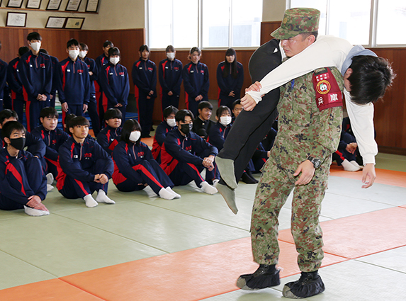 続いて学年別で3年生は「赤穂防災士の会」を講師にアルファ化米の炊き出しを体験。2年生は避難所体験ゲームで災害時の行動のあり方を考えた。1年生は救命救急訓練などを実施。搬送訓練では、けが人を1人で担いで運ぶ方法を自衛隊員から教わった。自身も高校2年生のときに被災したという講師の河内信行さん(47)=同本部相生地域事務所広報官=は「道具がないときに役立つのは知恵。命を助けるための知恵を覚えておいてほしい」と呼び掛けた。