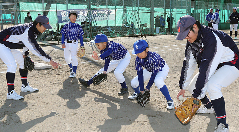 キャッチボールでは「ワンバウンドになってもいいから、強いボールを投げよう」とアドバイス。守備練習ではゴロを捕るときの構えや、捕球した後の送球動作を身振りを交えて説明した。幼稚園世代の子どもたちは女子マネージャーが転がすボールを元気に追いかけた。