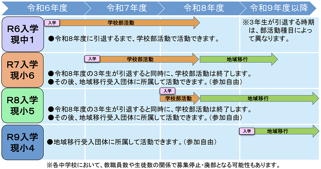 新たに決定した方針では、現在の中学1年生が最終学年となる26年度に3年生が引退したタイミングで学校部活動を終了。その後は地域の受入団体が受け皿となる。そのため、現在の小学6年生と5年生の世代は途中で部活動から受入団体へ移行することになり、現在の小学4年生は入学時から受入団体で活動することになる。