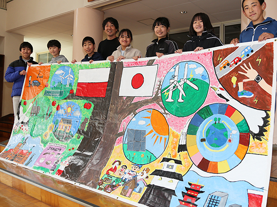 インターネットを通じて英語で交信し、1学期は自己紹介や相手国に関する調べ学習に取り組んだ。2学期はSDGsの目標の一つ「エネルギーをみんなに。そしてクリーンに」を課題に設定して学習を深め、その成果を表す手段として巨大壁画を制作。縦1・5メートル、横3・6メートルのテント地をキャンパスに、まず右半分を原小の子どもたちが描いてからポーランドに輸送し、ゼスポウの児童らが左半分を描いて完成させた。