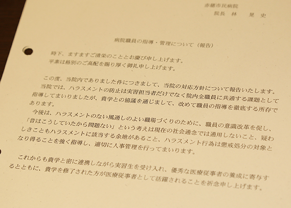 文書は林晃史院長名義で、「当院では、ハラスメントの防止は実習担当者だけでなく院内全職員に共通する課題として指導してまいりましたが、貴学との協議を通じまして、改めて職員の指導を徹底する所存」「ハラスメント行為は懲戒処分の対象となり得ることを強く指導し、適切に人事管理を行ってまいります」などと記載。再発防止に取り組む意向は示されているが、男子学生への謝罪はない。