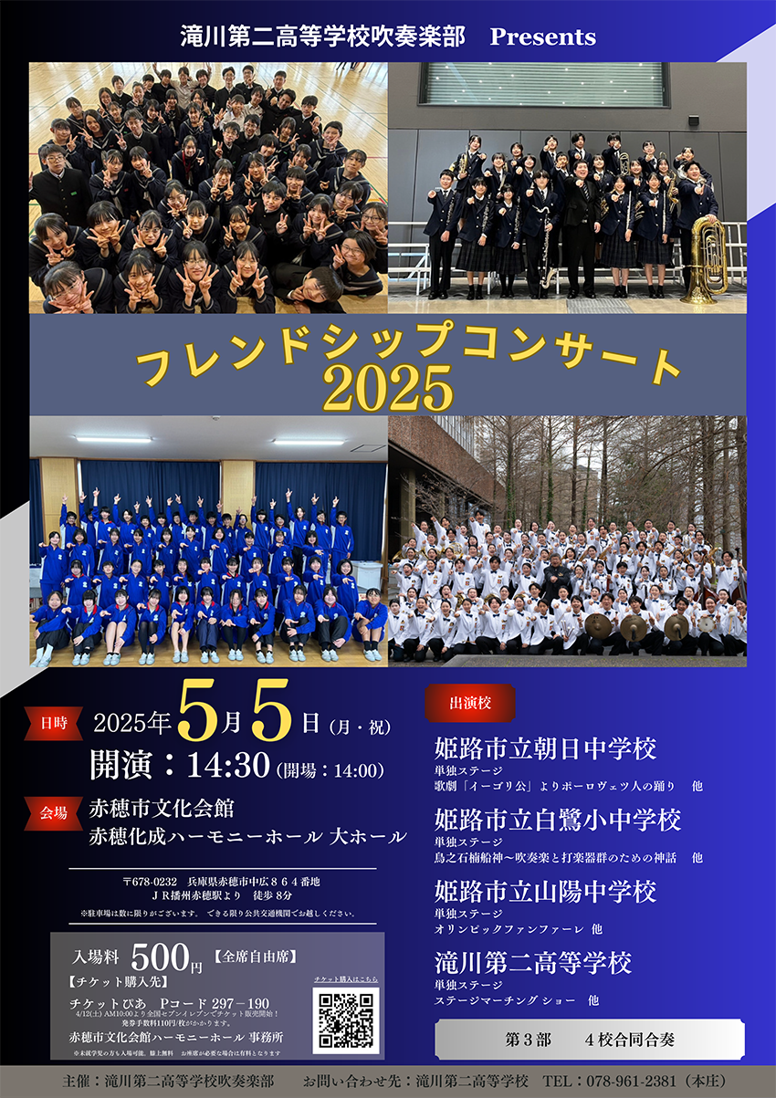 滝川第二高と姫路市立朝日、白鷺、山陽の3中学が単独ステージと4校合同演奏を披露する。