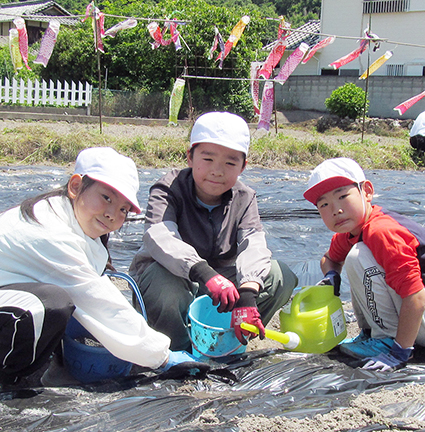畑に敷いた防草シートに専用の器具を使って等間隔で穴を開け、アメリカ綿の種を2〜3粒ずつまいて燻炭をかぶせた。子どもたちは「元気な芽を出して」と願いながら、じょうろで水やり。野崎暖介君(8)は「(シートに)穴を開けるのが大変だった。種まきは楽しかった」。