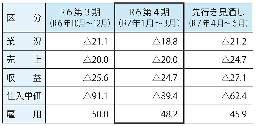 前回調査時は、当期の業況DIはマイナス10・0の見通しだったが、8・8ポイント下振れした。調査に回答した事業所からは「給料のボトムアップで固定費増となり収益が減少」(運輸業)といった声があったという。