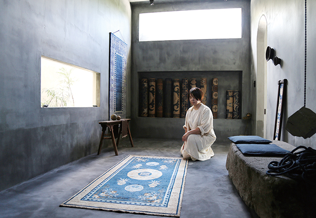 元々一つ屋根の隣家を購入し、仕切り壁を撤去。1階のアトリエ横に新たにギャラリーを設け、壁と床をグレー系の漆喰仕上げで統一した。ギャラリーの天窓からは柔らかな光が差し込み、落ち着いた雰囲気。倍以上の広さになった2階はアンティーク家具を置き、「暮らしの中にある赤穂緞通」を提案するショールームとして活用していくという。