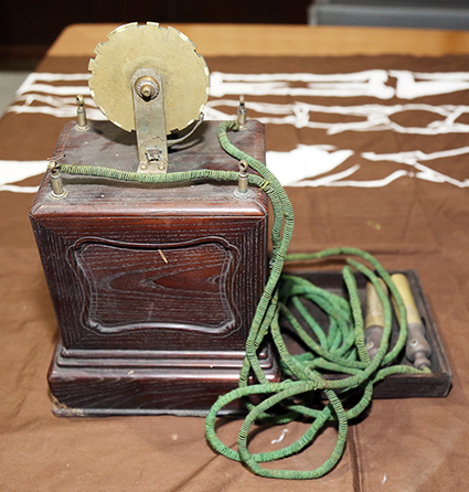 器具があったのは、江戸時代中期頃より旧揖東郡一橋家領取りまとめ庄屋で豪農として栄え、現在は家屋敷が国指定重要文化財となっている堀家(同市龍野町日飼)の分家。昨年蔵の改修に向けて中を整理していたところ発見された。コイルを収めた木箱(高さ約20センチ、幅約20センチ、奥行約16センチ)の上に歯車のような形状の円盤があり、取っ手を持って回転させる構造。箱の蓋の四隅にある金属製の端子に真ちゅう製のグリップがついたコードがつながっている。
