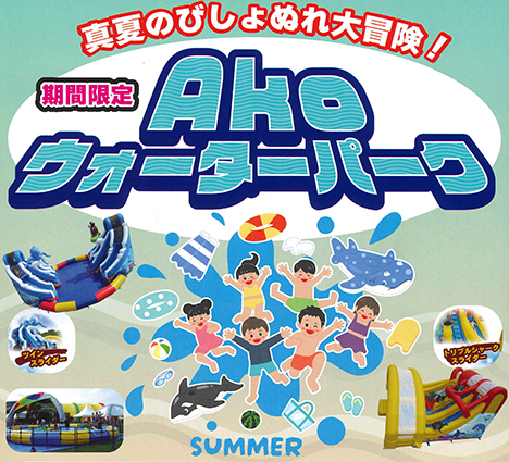 大型のバルーンプールを期間限定で設置する「Akoウォーターパーク」が7月19日(土)から御崎の赤穂海浜公園にオープン。夏休みのちびっ子たちでにぎわいそうだ。