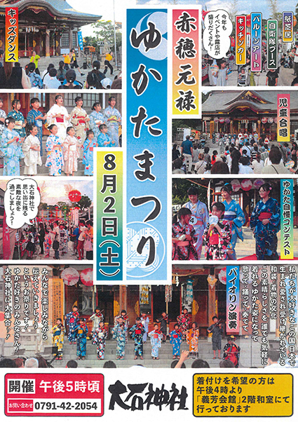 上仮屋の赤穂大石神社で8月2日(土)午後5時から7時半ごろまで「赤穂元禄ゆかたまつり」が開催される。色とりどりの吹き流しや提灯、風鈴で飾り付けた境内と参道に露店が並び、夏の風情を楽しめる。
