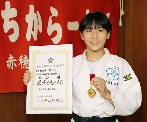 今月3日に広島市で行われた柔道の中国中学校選手権で砂子の北山暖(はる)さん(14)=岡山学芸館清秀3年=が女子44キロ級で初優勝。3連覇した7月の岡山県大会に続いて頂点に立った。