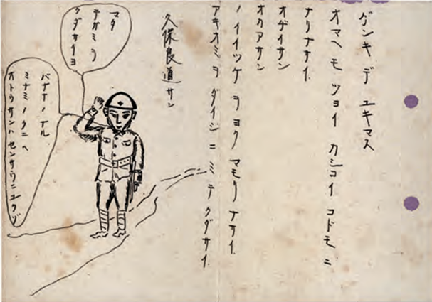 ビルマへ上陸してからしばらくの間に書かれた便りには、子どもたち向けに現地の風景を描き添えるなどゆとりが感じられるが、連合国軍との交戦が本格的になった時期からは小さな字でびっしりと書き込まれ、手紙を出せる貴重な機会にできるだけ多くのことを伝えようとする緊張感がうかがえる。山中良平学芸員によると、部隊の行動や経路といった軍事情報が漏れないよう、手紙に日付は書かれていないが、「義士会の日」「今日は周世のお祭りの日です」などと家族には手紙を書いた日が伝わるように記しているという。