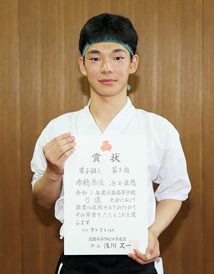 弓道の近畿高校大会で赤穂3年の池田佳應(よしのり)君(17)が男子個人で2位となった。
