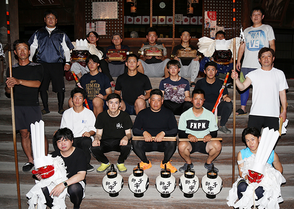 稽古初日は日が暮れてから保存会メンバー約20人が集まり神社鳥居横で練習。太鼓を担当する金坂謙悟さん(34)=松原町=は「一生に一度の経験と思って全力をぶつけたい」と日中の暑さが残る中、汗を流して稽古に励んだ。