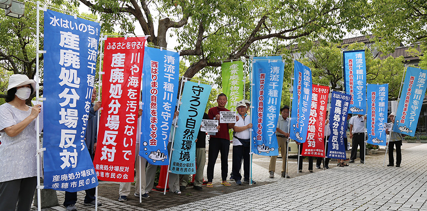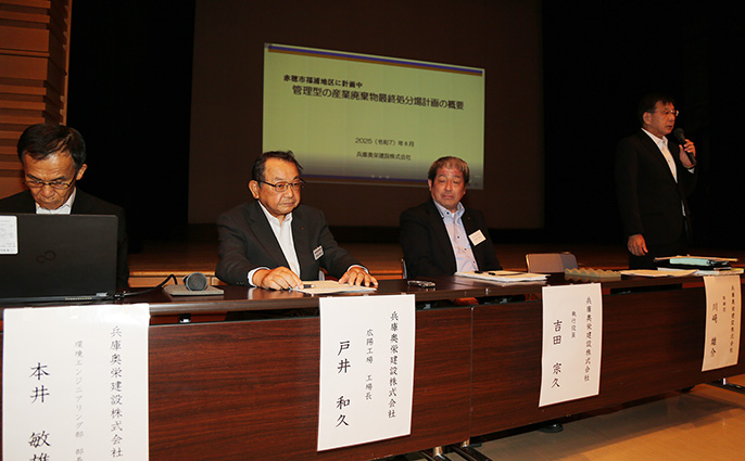 説明会は、事業計画の一部変更に伴い、同社が県条例に基づき開催し、2日間で約45人が来場。会場の赤穂化成ハーモニーホール周辺では、のぼり旗を持った市民約20人が「計画反対」をアピールした。参加した市民の一人は「埋め戻し計画がまったくのでたらめで、市民をだます目くらましのものだとはっきりわかった。そのような業者を信用できるわけがない」と批判。別の参加者は「8000ベクレル未満の汚染土は持ち込むということか」と危惧した。