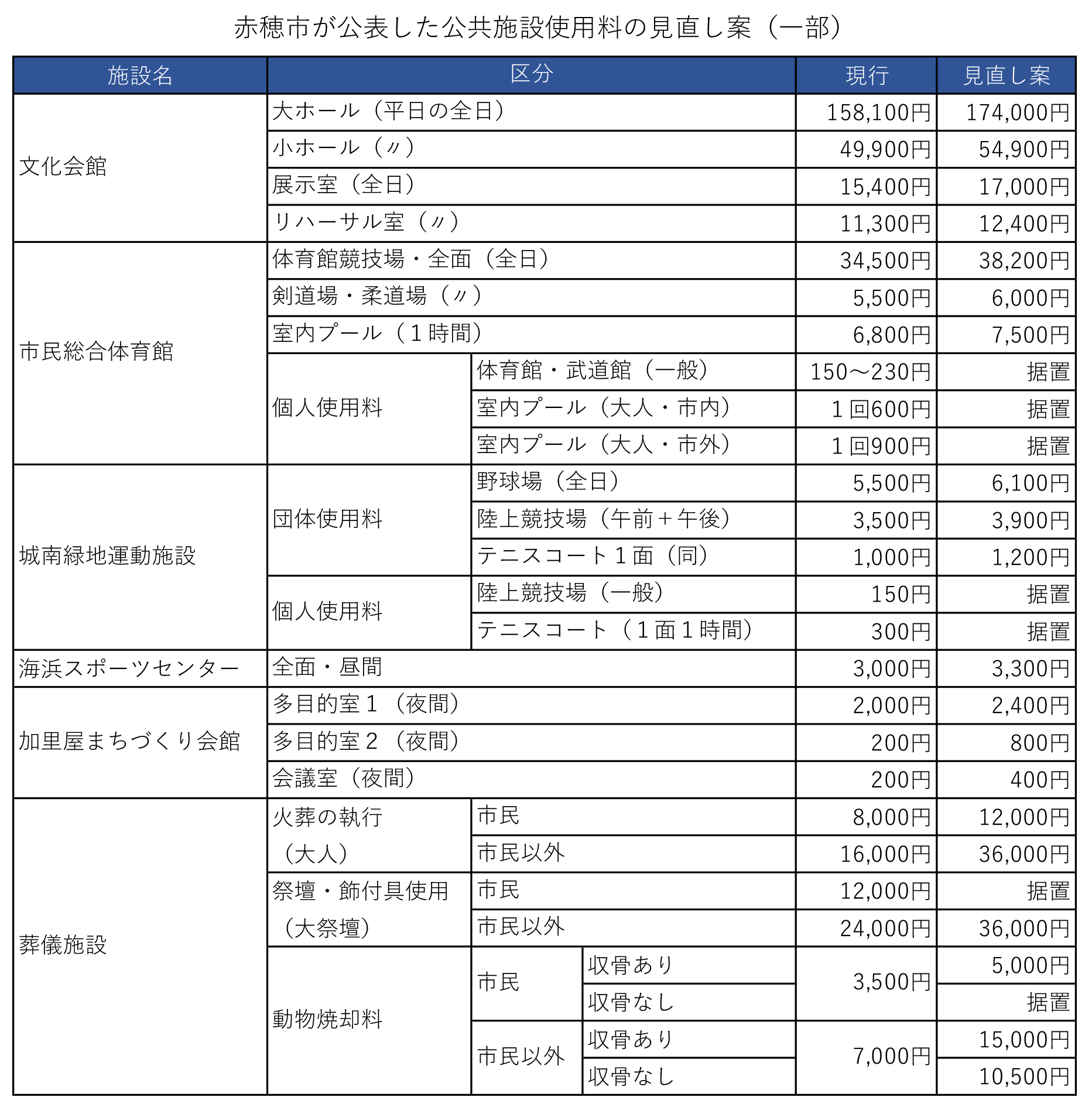 赤穂市は、文化会館やスポーツ施設など公共施設使用料の一部を値上げする見直し案をまとめた。市民から意見を求めるパブリックコメントを実施している。