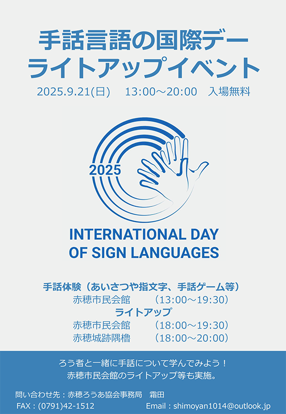 加里屋中洲の赤穂市民会館で午後1時〜7時半、手話体験イベント(入場無料)を開くほか、同日夜に同会館と上仮屋の赤穂城跡隅櫓をシンボルカラーの青色にライトアップする。