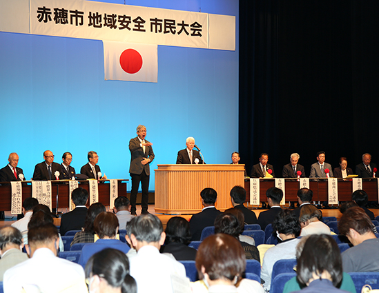 犯罪や事故のない社会の実現へ市民と関係団体が連携を図る「赤穂市地域安全市民大会」が27日、中広の赤穂化成ハーモニーホールであり、「社会のルールを守り、安心して暮らせる赤穂市の実現に向けて行動する」との大会宣言を満場一致で採択した。