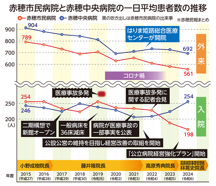 市は医師不足や人口減少などを要因に挙げるが、同じ赤穂市に立地する赤穂中央病院では外来患者数に大きな減少は見られず、入院患者数は増加に転じている。
