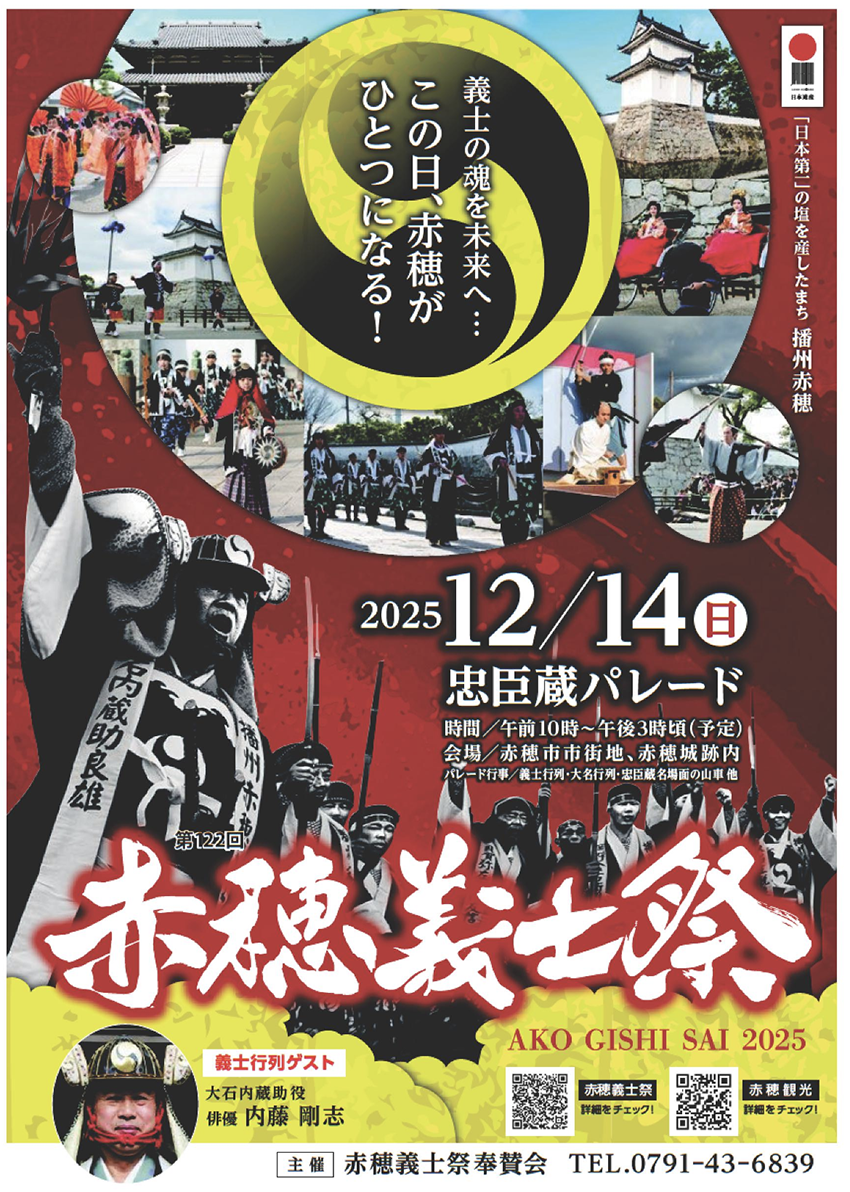 大石内蔵助以下47人が吉良邸に討ち入った日にちなむ赤穂義士祭は12月14日(日)に加里屋の市街一帯で開催される。