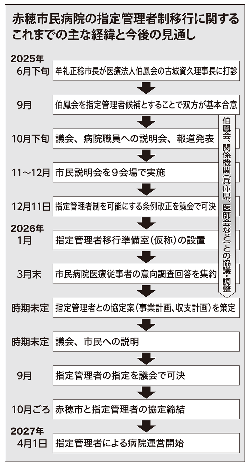 経営形態移行をめぐっては、牟礼正稔市長が今年6月下旬、赤穂中央病院を運営する医療法人伯鳳会の古城資久理事長に指定管理者候補となる意向を打診。前向きな反応を受けて話が進み、9月ごろには基本合意に至った。双方の病院の担当者レベルが顔を合わせる分科会で指定管理者制の導入に向けた課題を話し合いつつ、10月下旬に議会、病院職員への説明を経て報道発表。11月中旬から12月初旬にかけて市内9地区で市民説明会を開いた。