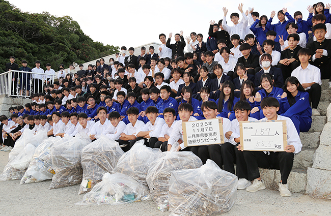 赤穂高校は11月7日に御崎の唐船海岸で活動を行い、生徒と教員の計157人が参加した。回収したごみの重さは海辺に漂着したペットボトルや廃プラスチックなど55・5キログラムに上った。生徒会副会長の玉石直子さん(17)は「ごみがなくなった海辺を見て気持ちがすっきりした。世界記録になったのもすごい」とギネス認定を喜んだ。