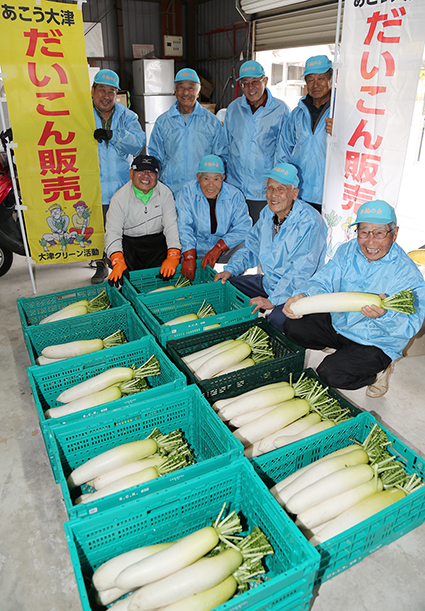 ベテラン農家有志の「大津年輪の会」(旧林茂存代表)が有機栽培する青首ダイコンは、兵庫県が定める土づくりや農薬などの審査基準をクリアして「ひょうご安心ブランド」に2004年から継続して認定されている。味の良さにも定評があり、直売会には毎年大勢の人が来場する。