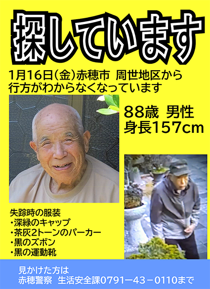 赤穂市周世の80代男性が1月16日から行方不明になり、家族や警察などが探している。