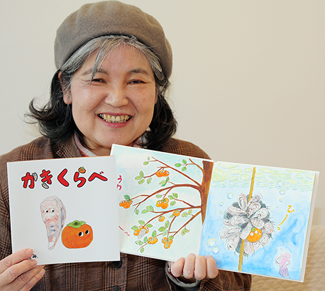 海の幸の「かき」と果物の「かき」を主人公に描いたオリジナル絵本『かきくらべ』を清水町のグラフィックデザイナー、益田美穂子さん(64)が自費出版した。ほっこりしたショートストーリーを温かみのある絵で描き、子どもも大人も楽しめる。