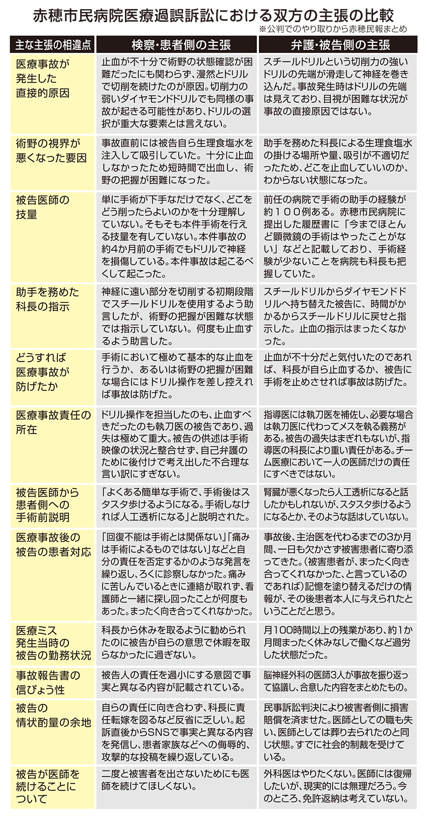 一方、弁護側は、「事故発生時はドリルの先端は見えていたが、ドリルの先端が滑走して神経を巻き込んだ」として、術野の悪化が直接の原因ではないと反論した。「助手を務めた科長が切削力の強いドリルを使えと指示した。(切削部の冷却などを目的に)助手が掛けた生理食塩水の量や吸引が不適切だったため、どこを止血していいのか、わからない状態になった」と科長の補助に問題があったと主張。「指導医は執刀医を補佐し、必要な場合は執刀医に代わってメスを執る義務がある。被告の過失はまぎれもないが、指導医の科長により重い責任がある」として、量刑の考慮を求めた。