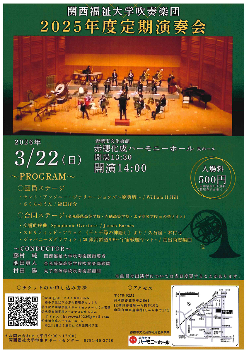 関西福祉大学吹奏楽団の定期演奏会が3月22日(日)、中広の赤穂化成ハーモニーホールで開催される。
