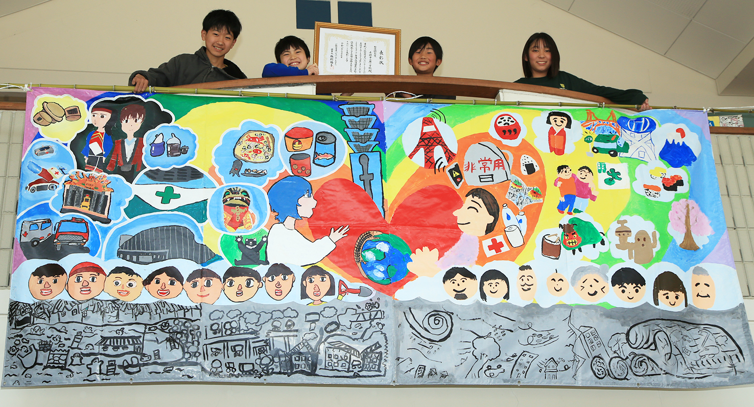 「アートマイル国際協働学習プロジェクト」で特別賞を受賞した原小学校の6年生児童と作品