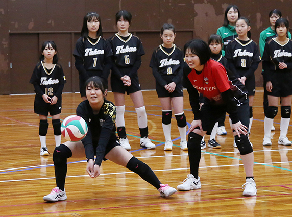 トスやレシーブなど基本プレーを中心に選手らが手本を見せ、子どもたちが反復練習。ボールに対する体の向け方や腕の角度などを丁寧に教えた。御崎少女バレーボールスポーツ少年団の西川愛宝(まなほ)さん(9)と大岩根樺乃(かのん)さん(9)は「ためになることばかり。チームのみんなで練習して、もっとうまくなりたい」と上達に意欲をみせた。