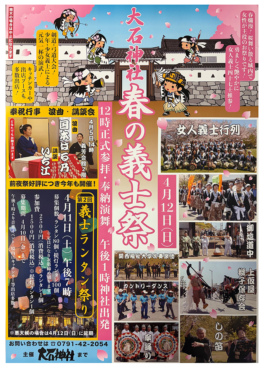 毎年12月に行われる「赤穂義士祭」は史実に基づき義士行列の出演者を男性に限定している。「女性が参加できる機会を」との声を受け、同神社が2004年から女性たちが討ち入り装束で四十七士に扮して練り歩く女人義士行列を「春の義士祭」で始めた。桜が咲く城下を華やかに歩く様子が見物客に好評だ。
