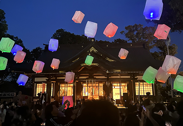 前夜には「義士ランタン祭り」が同神社境内であり、赤や青などのLED電球が入った紙製ランタンが夜空に浮かび、来場者が幻想的な情景を楽しんだ。