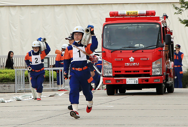 2年に一度の大会で、市内に15ある消防団が日頃の訓練成果を発表した。今年ポンプ車が更新された第15分団で指揮者を務めた川端清さんは「団員が揃う時間の確保が難しい中、新車の扱いに慣れるように訓練してきた。きょうの競技は反省点もあるが、できるだけ頑張った」と話した。