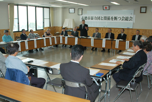 冒頭のあいさつで藤野高之会長は、昨年に市役所近くのビルが組事務所に認定されたことに触れ、「最近は県外ナンバーの車が出入りしている。環境汚染などを材料に企業をゆすっているとの話もある」と状況説明。「暴力団は金や仕事のあるところを狙ってくる。一致団結して対処を」と警戒を呼びかけた。