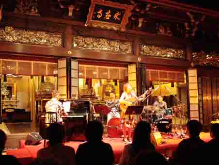 本尊をバックに本堂にしつらえた特設ステージで約10曲を披露。金箔が荘厳な光を放つ中、ピアノ、ベース、ドラムの演奏でムーディな歌声を響かせ、1曲ごとに満員の客席から拍手が沸いた。