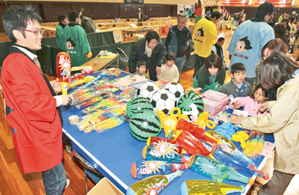 海浜町の高谷洋友君(5)はパチンコゲームで1等が当たってにっこり。「次は迷路に行くよ」と母親の手を引いた。4月に御崎幼稚園に入園する元塩町の平野絢女ちゃん(4)は兄智大君(6)と来場。たっぷり楽しんだようすで「来年もあるといいな」と話していた。