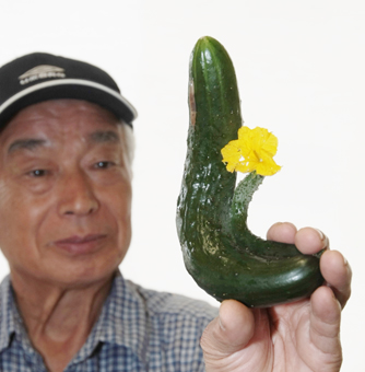 くの字に曲がった長さ約20センチの親キュウリの内側に半分ほどの子キュウリが寄り添い、先端に黄色い花をつけている。山本さんが5月中旬に20株植えた苗の初成りという。