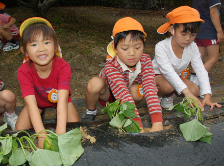 職員が世話をし、11月ごろに再び園児らが菜園を訪れて収穫する予定。山本涼矢君(5)は「みんなで焼きイモが食べたいな」と秋を楽しみにしていた。