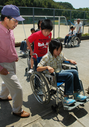 視覚に障害がある人を誘導する場合は左側に立って右ひじを持ってもらうことも学習した。2年生の前田乙機君(7)は「声をかけてあげながら歩くことが大切とわかった」と話していた。